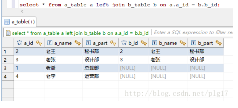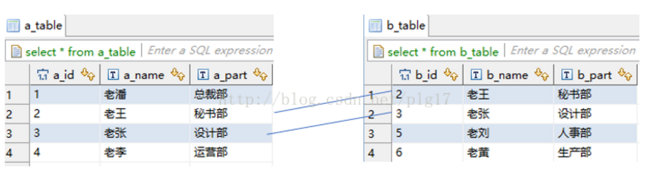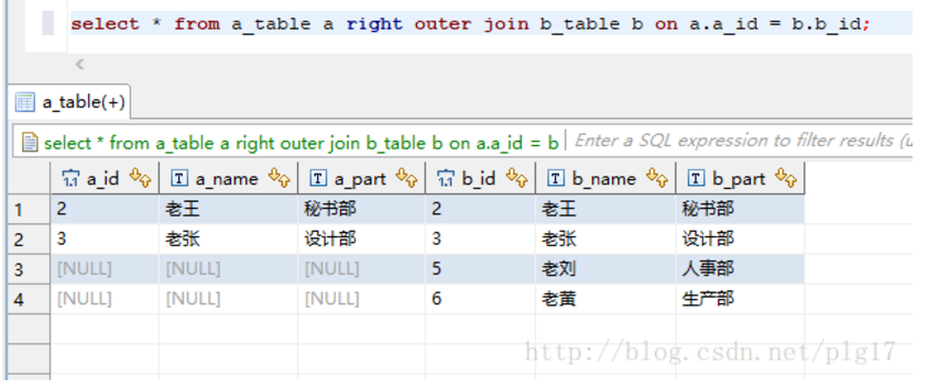 语句:select * from a_table a right outer join b_table b on a.a_id = b.b_id;
