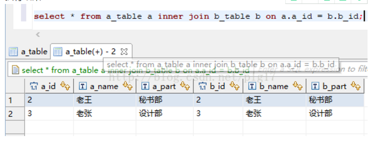 语句:select * from a_table a inner join b_table b on a.a_id = b.b_id;