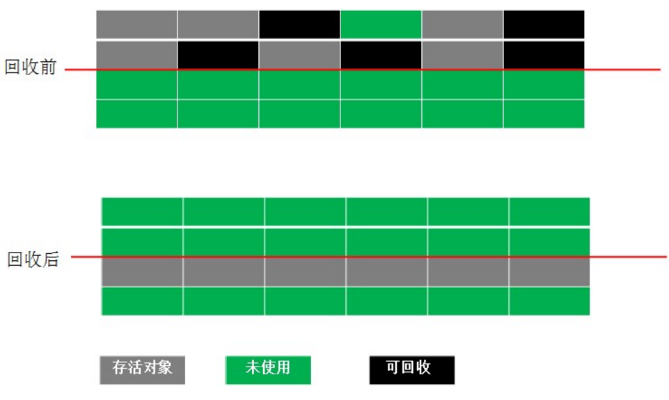 该算法标记阶段和Mark-Sweep一样,但是在完成标记之后,它不是直接清理可回收对象,而是将存活对象都向一端移动,然后清理掉端边界以外的内存。所以,特别适用于存活对象多,回收对象少的情况下。效率比“标记-清理”算法低,但不会产生内存碎片。