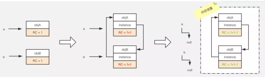 我们可以看到,最后这2个对象已经不可能再被访问了,但由于他们相互引用着对方,导致它们的引用计数永远都不会为0,通过引用计数算法,也就永远无法通知GC收集器回收它们。