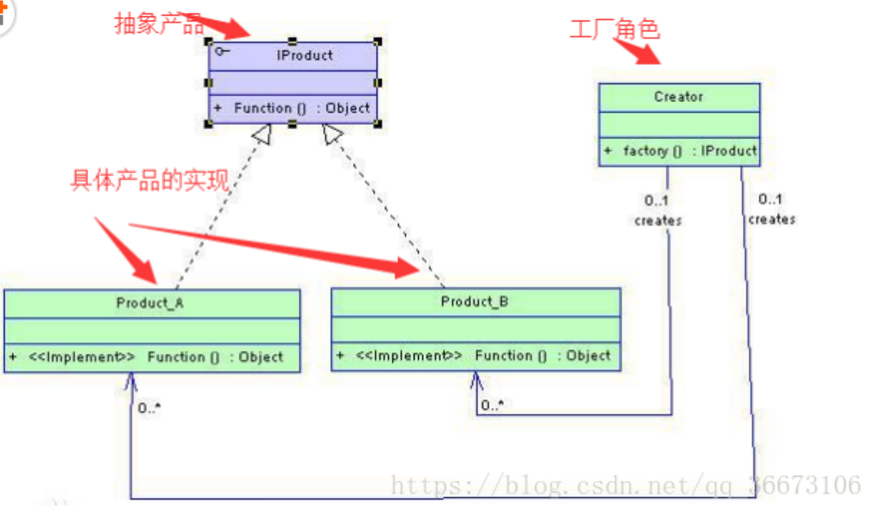 简单工厂模式的实质是由一个工厂类根据传入的参数,动态决定应该创建哪一个产品类(产品类继承自一个父类或接口)的实例。该模式中包含的角色及其职责工厂(Creator)角色简单工厂模式的核心,它负责实现创建所有实例的内部逻辑。工厂类的创建产品类的方法可以被外界直接调用,创建所需的产品对象。抽象产品(Product)角色负责描述所有实例所共有的公共接口(可理解为父类)。具体产品(Concrete Product)角色是简单工厂模式的创建目标,所有创建的对象都是充当该角色的某个具体类的实例。场景实现: