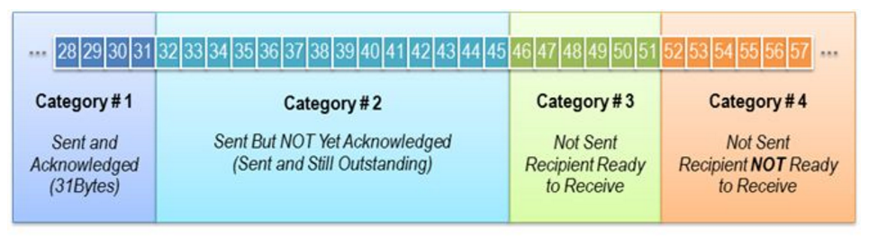 1)对于TCP会话的发送方,任何时候在其发送缓存内的数据都可以分为4类,“已经发送并得到对端ACK的”,“已经发送但还未收到对端ACK的”,“未发送但对端允许发送的”,“未发送且对端不允许发送”。“已经发送但还未收到对端ACK的”和“未发送但对端允许发送的”这两部分数据称之为发送窗口