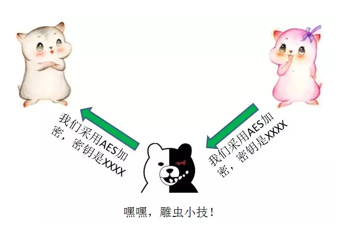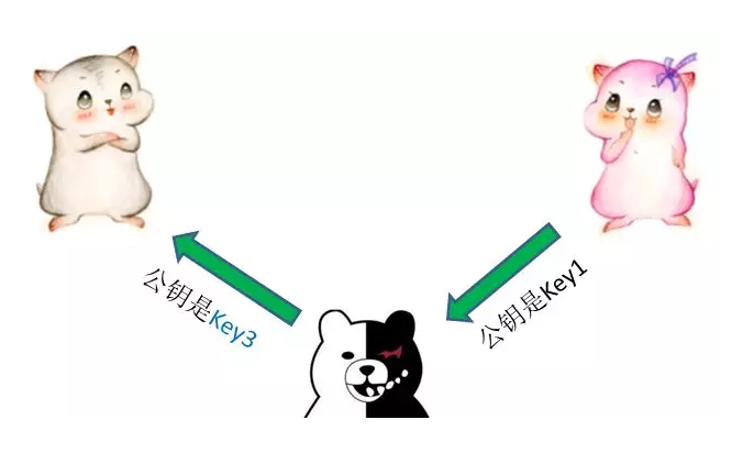 中间人虽然不知道小红的私钥是什么,但是在截获了小红的公钥Key1之后,却可以偷天换日,自己另外生成一对公钥私钥,把自己的公钥Key3发送给小灰。