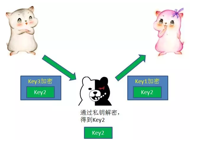 这一次通信再次被中间人截获,中间人先用自己的私钥解开了Key3的加密,获得Key2,然后再用当初小红发来的Key1重新加密,再发给小红。