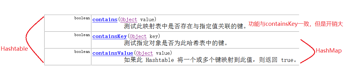 ④HashMap废除了contains方法:HashMap废弃了HashTable的contains方法去掉了,两者中都有containsValue和containsKey