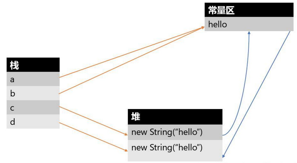 而a==b=true 是因为在JVM中存在着一个字符串池,其中保存着很多String对象,并且可以被共享使用,a,b引用的是同一个常量池中的对象,当创建一个字符串常量时,会首先在字符串常量池中查找是否已经有相同的字符串被定义(其判断依据是String类的equals方法的返回值),若已经定义则直接获取对其的引用,此时不需要创建对象;若没有定义,则需要创建这个对象,然后将其加入到字符串池中,再将它的引用返回。(由于String是不可变类,一旦创建好了就不能被修改,因此String对象可以被共享且不会导致程序的混乱)。