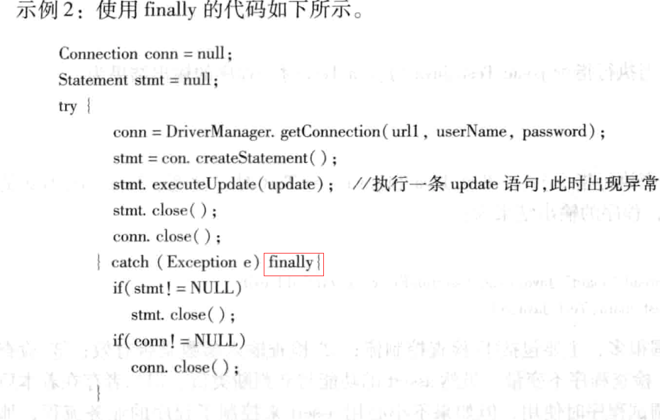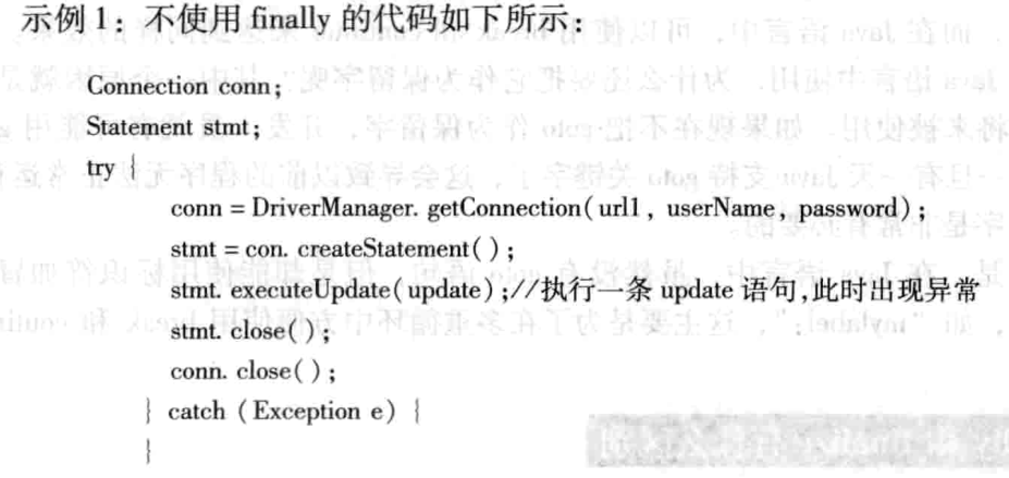 正常情况下,程序运行没有问题;当update语句出现异常时,后面的close()方法将不会被调用,数据库的连接将得不到释放。这样长期运行后,将会耗尽数据库的连接资源,通过使用finally可以保证任何情况下数据库的连接资源都可以被释放