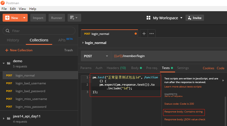 点击`Tests`标签,点击`Status code:code is 200`生成代码片段