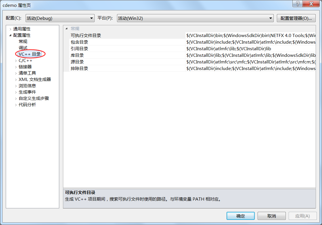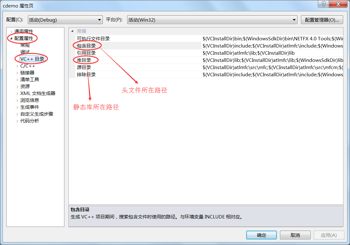 为了让头文件更加具有实践意义,Windows 下的 IDE 都可以为静态库和头文件设置默认目录。以 Visual Studio 为例,在当前工程名处单击鼠标右键,选择“属性”,在弹出的对话框中就可以看到已经设置好的路径,如下图所示: