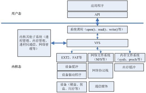 VFS就是把各种具体的文件系统的公共部分抽取出来,形成一个抽象层,是系统内核的一部分。他位于用户程序和具体的文件系统之间。它对用户程序提供了标准的文件系统调用接口,对具体的文件系统(比如:Ext2、FAT32等),它通过一系列的对不同文件系统通用的函数指针来调用对应的文件系统函数,完成相应的操作。任何使用文件系统的程序必须通过这层接口来访问。通过这样的方式,VFS就对用户屏蔽了底层文件系统的实现细节和差异。