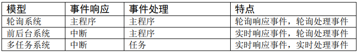 在顺序执行后台程序的时候,如果有中断来临,那么中断会打断后台程序的正常执行流,转而去执行中断服务程序,在中断服务程序里面标记事件,如果事件要处理的事情很简短,则可在中断服务程序里面处理,如果事件要处理的事情比较多,则返回到后台程序里面处理。虽然事件的响应和处理是分开了,但是事件的处理还是在后台里面顺序执行的,但相比轮询系统,前后台系统确保了事件不会丢失,再加上中断具有可嵌套的功能,这可以大大的提高程序的实时响应能力。在大多数的中小型项目中,前后台系统运用的好,堪称有操作系统的效果。