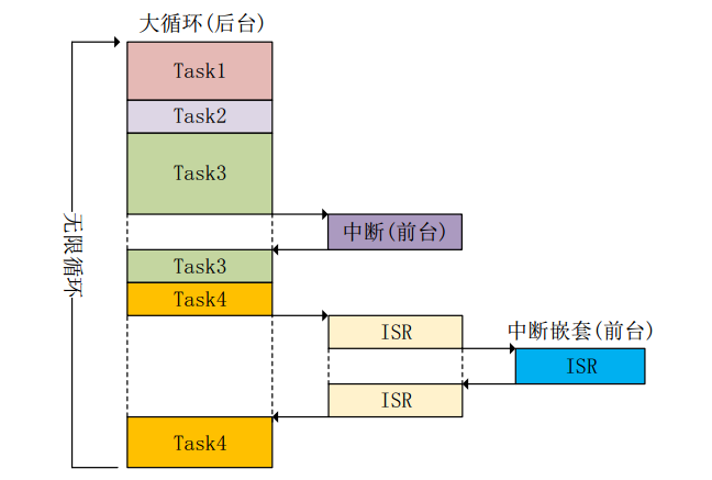 相比轮询系统,前后台系统是在轮询系统的基础上加入了中断。外部事件的响应在中断里面完成,事件的处理还是回到轮询系统中完成,中断在这里我们称为前台, main 函数里面的无限循环我们称为后台。在顺序执行后台程序的时候,如果有中断来临,那么中断会打断后台程序的正常执行。