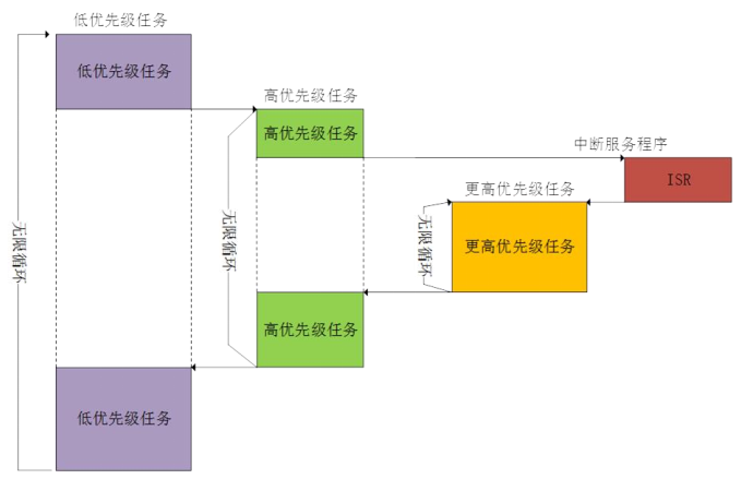 相比前后台系统,多任务系统的事件响应也是在中断中完成的,但是事件的处理是在任务中完成的。在多任务系统中, 任务跟中断一样,也具有优先级,优先级高的任务会被优先执行。当一个紧急的事件在中断被标记之后,如果事件对应的任务的优先级足够高,就会立马得到响应。相比前后台系统,多任务系统的实时性又被提高了。