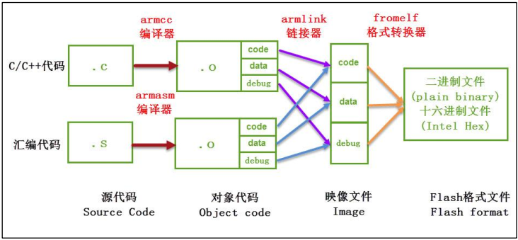 (1) 编译, MDK 软件使用的编译器是 armcc 和 armasm,它们根据每个 c/c++和汇编源文件编译成对应的以“ .o”为后缀名的对象文件(Object Code,也称目标文件),其内容主要是从源文件编译得到的机器码,包含了代码、数据以及调试使用的信息;