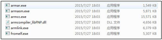 (1) 提示信息的第一部分说明构建过程调用的编译器。图中的编译器名字是“ V5.06(build20)”,后面附带了该编译器所在的文件夹。在电脑上打开该路径,可看到该编译器包含图 51-3 中的各个编译工具,如 armar、 armasm、 armcc、 armlink 及 fromelf,后面四个工具已在下图已讲解,而 armar 是用于把.o 文件打包成 lib 文件的。