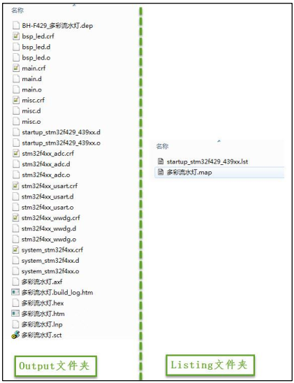 构建完成后,可在工程的“ Output”及“ Listing”目录下找到由以上过程生成的各种文件,见下图: