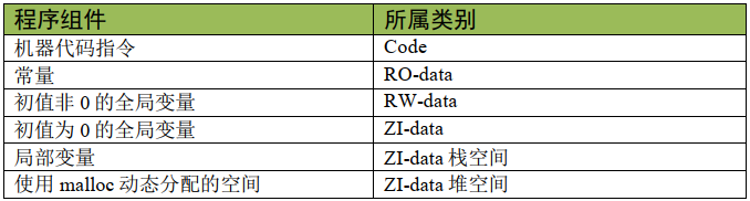 ZI-data 的栈空间(Stack)及堆空间(Heap):在 C 语言中,函数内部定义的局部变量属于栈空间,进入函数的时候从向栈空间申请内存给局部变量,退出时释放局部变量,归还内存空间。而使用 malloc 动态分配的变量属于堆空间。在程序中的栈空间和堆空间都是属于 ZI-data 区域的,这些空间都会被初始值化为 0 值。编译器给出的 ZI-data 占用的空间值中包含了堆栈的大小(经实际测试,若程序中完全没有使用 malloc 动态申请堆空间,编译器会优化,不把堆空间计算在内)。