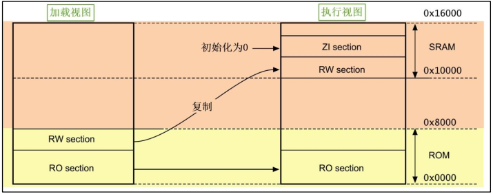 程序在存储状态时, RO 节(RO section)及 RW 节都被保存在 ROM 区。当程序开始运行时,内核直接从 ROM 中读取代码,并且在执行主体代码前,会先执行一段加载代码,它把 RW 节数据从 ROM 复制到 RAM, 并且在 RAM 加入 ZI 节, ZI 节的数据都被初始化为0。加载完后 RAM 区准备完毕,正式开始执行主体程序。