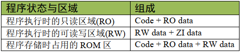当程序存储到 STM32 芯片的内部 FLASH 时(即 ROM 区),它占用的空间是 Code、RO-data 及 RW-data 的总和,所以如果这些内容比 STM32 芯片的 FLASH 空间大,程序就无法被正常保存了。当程序在执行的时候,需要占用内部 SRAM 空间(即 RAM 区),占用的空间包括 RW-data 和 ZI-data。应用程序在各个状态时各区域的组成见下表: