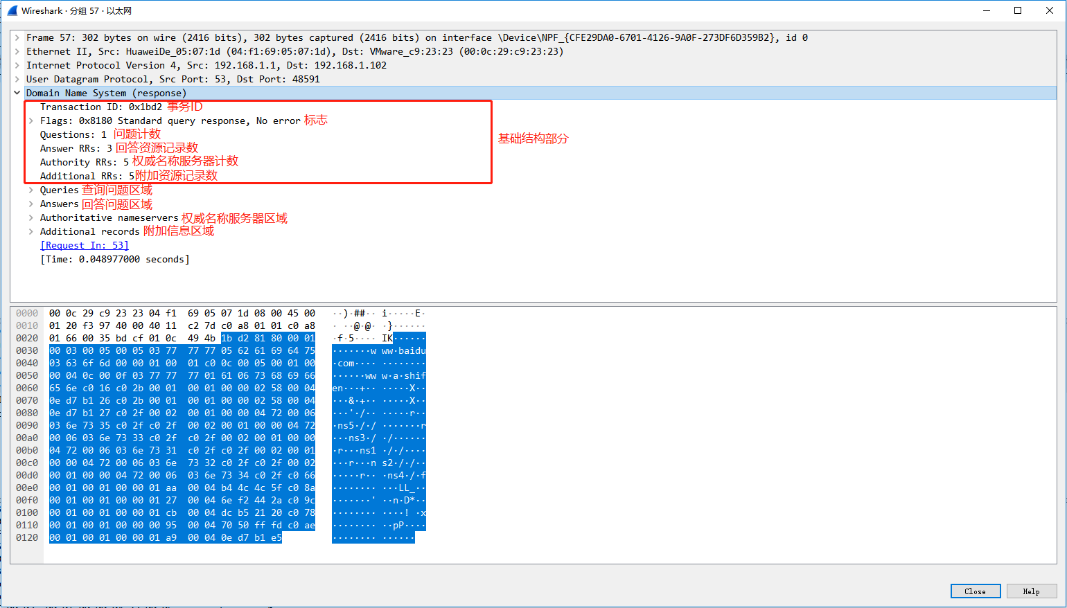 Frame 57: 302 bytes on wire (2416 bits), 302 bytes captured (2416 bits) on interface \Device\NPF_{CFE29DA0-6701-4126-9A0F-273DF6D359B2}, id 0 Ethernet II, Src: HuaweiDe_05:07:1d (04:f1:69:05:07:1d), Dst: VMware_c9:23:23 (00:0c:29:c9:23:23) Internet Protocol Version 4, Src: 192.168.1.1, Dst: 192.168.1.102 User Datagram Protocol, Src Port: 53, Dst Port: 48591 Domain Name System (response) Transaction ID: 0x1bd2 Flags: 0x8180 Standard query response, No error Questions: 1 Answer RRs: 3 Authority RRs: 5 Additional RRs: 5 Queries #问题部分 www.baidu.com: type A, class IN Name: www.baidu.com #查询名字段, 这里请求域名baidu.com [Name Length: 13] [Label Count: 3] Type: A (Host Address) (1) #查询类型字段, 这里为A类型 Class: IN (0x0001) #查询类字段, 这里为互联网地址 Answers Authoritative nameservers Additional records [Request In: 53] [Time: 0.048977000 seconds]