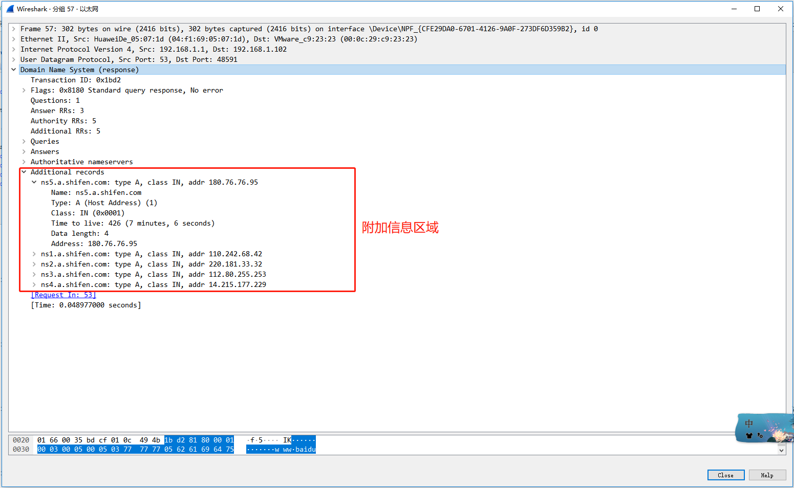 Frame 57: 302 bytes on wire (2416 bits), 302 bytes captured (2416 bits) on interface \Device\NPF_{CFE29DA0-6701-4126-9A0F-273DF6D359B2}, id 0 Ethernet II, Src: HuaweiDe_05:07:1d (04:f1:69:05:07:1d), Dst: VMware_c9:23:23 (00:0c:29:c9:23:23) Internet Protocol Version 4, Src: 192.168.1.1, Dst: 192.168.1.102 User Datagram Protocol, Src Port: 53, Dst Port: 48591 Domain Name System (response) Transaction ID: 0x1bd2 Flags: 0x8180 Standard query response, No error Questions: 1 Answer RRs: 3 Authority RRs: 5 Additional RRs: 5 Queries Answers Authoritative nameservers #“权威名称服务器区域”字段 a.shifen.com: type NS, class IN, ns ns5.a.shifen.com #资源记录部分 Name: a.shifen.com Type: NS (authoritative Name Server) (2) #类型字段, 这里为NS类型 Class: IN (0x0001) Time to live: 1138 (18 minutes, 58 seconds) Data length: 6 Name Server: ns5.a.shifen.com #权威名称服务器 a.shifen.com: type NS, class IN, ns ns3.a.shifen.com a.shifen.com: type NS, class IN, ns ns1.a.shifen.com a.shifen.com: type NS, class IN, ns ns2.a.shifen.com a.shifen.com: type NS, class IN, ns ns4.a.shifen.com Additional records [Request In: 53] [Time: 0.048977000 seconds]