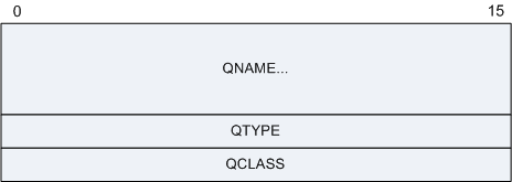 | 查询名 | 变长 | 域名被编码为一些labels序列,每个labels包含一个字节表示后续字符串长度,以及这个字符串,以0长度和空字符串来表示域名结束。注意这个字段可能为奇数字节,不需要进行边界填充对齐。 |