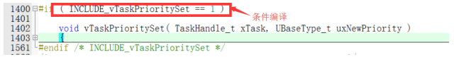 使用“INCLUDE_”开头的宏用来表示使能或除能 FreeRTOS 中相应的 API 函数, 作用就是用来配置 FreeRTOS 中的可选 API 函数的。比如当宏 INCLUDE_vTaskPrioritySet 设置为 0 的时候 表示不能 使用函数 vTaskPrioritySet() , 当设置 为 1 的时 候就表示可 以使用函 数vTaskPrioritySet()。这个功能其实就是条件编译,在文件 tasks.c 中有如下图所示的代码。
