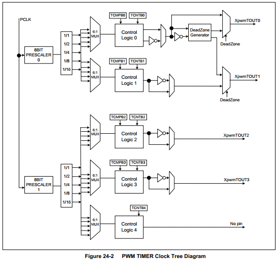 5)两个8位的预分频器prescaler是可编程的且根据装载的值来对PCLK进行分频,预分频器和时钟分频器的值分别存储在定时器配置寄存器TCFG0和TCFG1中;