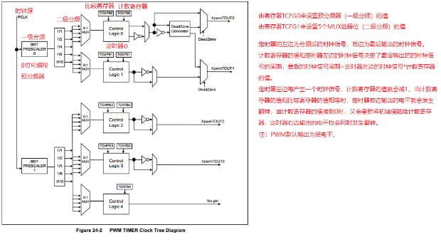 还是根据S3C2440手册的描述和上图的结构,要开始一个PWM定时器功能的步骤如下(假设使用的是第一个定时器):
