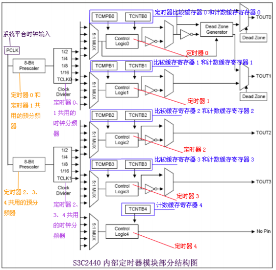 2)每个定时器都有一个比较缓存寄存器(TCMPB)和一个计数缓存寄存器(TCNTB);