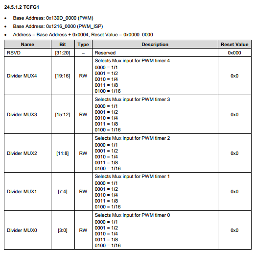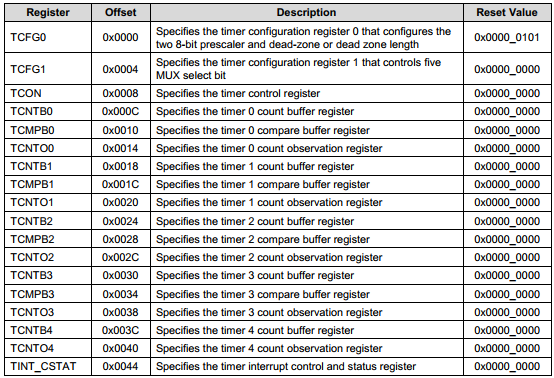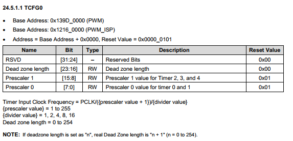 TCFG0寄存器:它配置两个8位的预分频器的值和死区长度,控制一级分频器,分频值和死区长度的都是为0~254