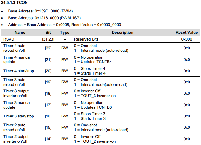 6)有一个TCON控制寄存器控制着所有定时器的属性和状态,TCON的第0~7位控制着定时器0、第8~11位控制着定时器1、第12~15位控制着定时器2、第16~19位控制着定时器3、第20~22位控制着定时器4。