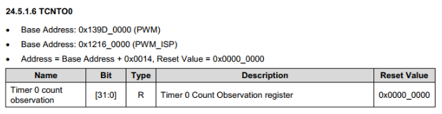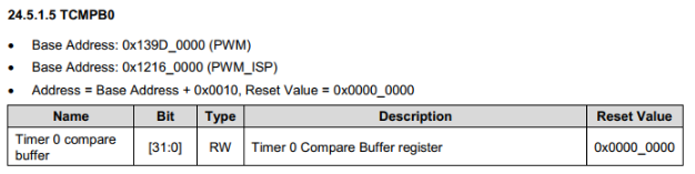 TCMPBn 的值用于脉冲宽度调制(PWM)。当定时器的递减计数器的值和比较寄存器的值相匹配的时候,定时器控制逻辑将改变输出电平。因此,比较寄存器决定了PWM 输出的开关时间。
