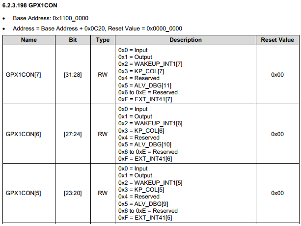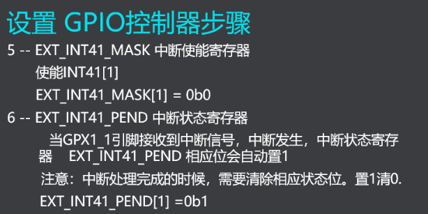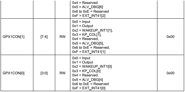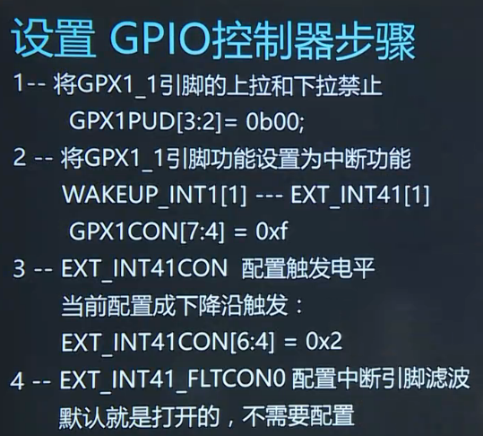 EXT_INT41_FLTCON0和EXT_INT41_FLTCON0寄存器:这两个寄存器用来管理一组(8个)引脚,用来滤波的。在芯片内部是有专门滤波的电路的。可以软件滤波也可以硬件滤波,硬件滤波可以节约一些CPU的时间。