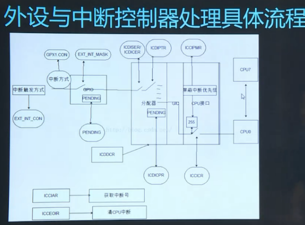 外部GPIO(芯片外围电路)有128个中断,当有多个中断同时产生时,GIC中断管理器就会对多个中断进行优先级的设置,将优先级高的先通过IRQ送往CPU进行处理