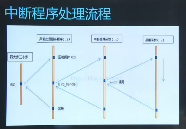 异常处理程序:在异常程序里面还要进行压栈保护,完后跳转到中断处理函数。