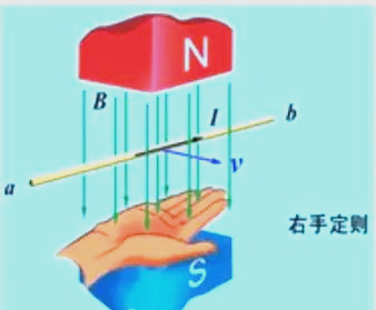 左手定则仍然可用于电动机的场景,因闭合电路中在磁场的作用下,产生力,左手平展,手心对准N极,大拇指与并在一起的四指垂直 ,四指指向电流方向,大拇指所指的方向为受力方向。