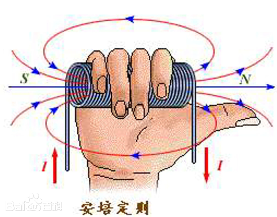 通电螺线管中的安培定则(安培定则二):用右手握住通电螺线管,弯曲的四指指向电流的方向,那么大拇指所指的那一端是通电螺线管的N极。