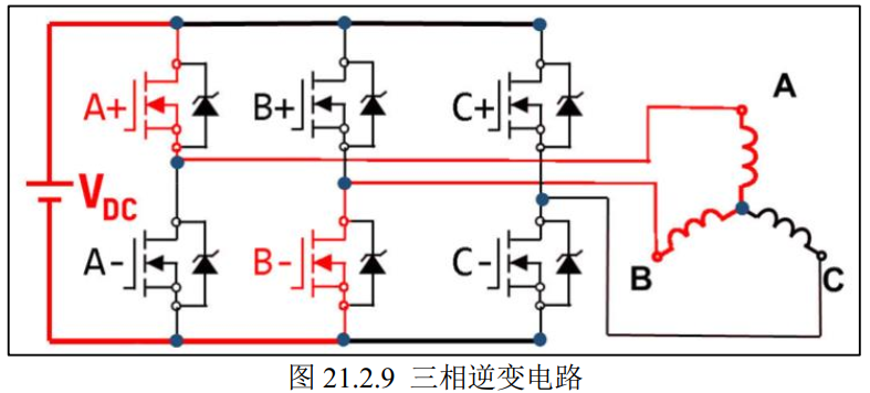 所谓的三相逆变电路就是由三个半桥构成的电路,图 21.2.9 中的 A+与 A-为一个半桥,B+与 B-以及 C+与 C-各自又为一个半桥,共三个半桥;这三个半桥各自控制对应的 A、 B、C 三相绕组;当控制 A 的上桥臂 A+导通时, 此时 A 相绕组接到电源正,当控制 B 的下桥臂B-导通时, 此时 B 相绕组接到电源负,所以此时电流由 A 流向 B。