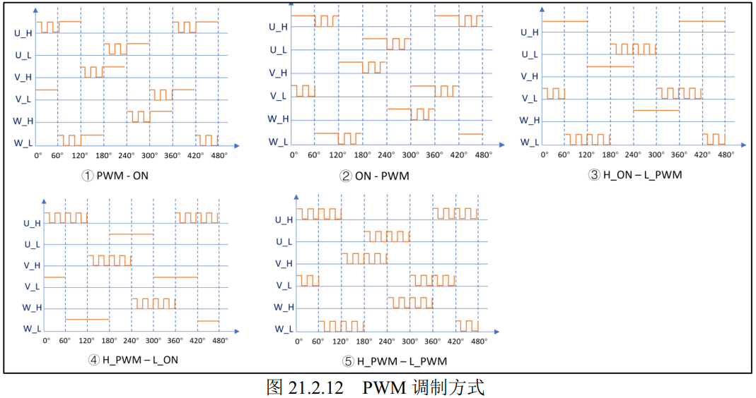 霍尔传感器信号情况为:霍尔#1、 霍尔#2、 霍尔#3 分别对应 1、 0、 1 情况为例, 上图中是同时使用 PWM 控制 B+和 C-桥臂, 称之为 pwm-pwm 型调制方式,实际上,还是有以下几种调制方式,比如 pwm_on 型、 on_pwm、H_on-L_pwm 型、 H_pwm-L_on型、H_pwm – L_pwm型等等不同的调制方式, 不同控制方式在性能上有不同的效果,当然针对实际的应用场合可以尝试多种调制方式, 然后选择最优方式。且均是电机处于 120°的运行方式下进行的。如下图: