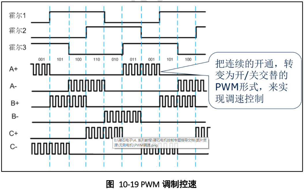 现在我们就上图具体说明调速过程,注意,上图的 PWM 调制控速对应的是反转模式(见几种常用电机 - 孤情剑客 - 博客园)。 现在我们就看霍尔传感器信号情况为:霍尔#1、 霍尔#2、 霍尔#3 分别对应 1、 0、 1 情况(其他五种情况都是相同原理), 我们先看前面霍尔传感器 - 孤情剑客 - 博客园表格10-2 可以知道此时应该是 B+和 C-导通,其他桥臂关断, 并且此时是 100%导通 B+和 C-这两个个桥臂,不用 PWM 控制其导通时间, 那么此时绕组中电流非常大,转子转动速度非常高。显然这种情况不是我们在实际上应用用常常用到的,在实际生产中,我们总是需要控制电机的转速。 现在引入 PWM 控制后什么情况呢?