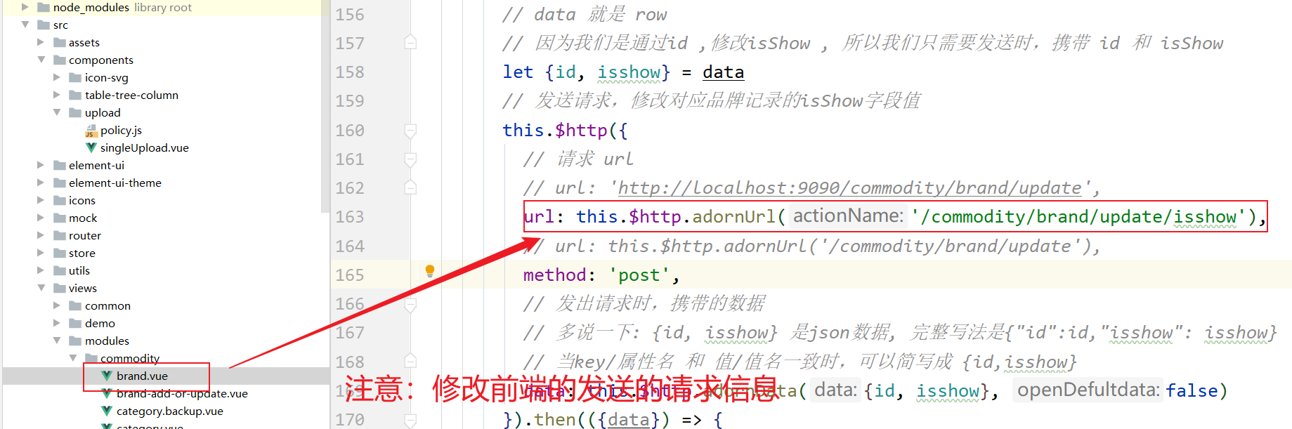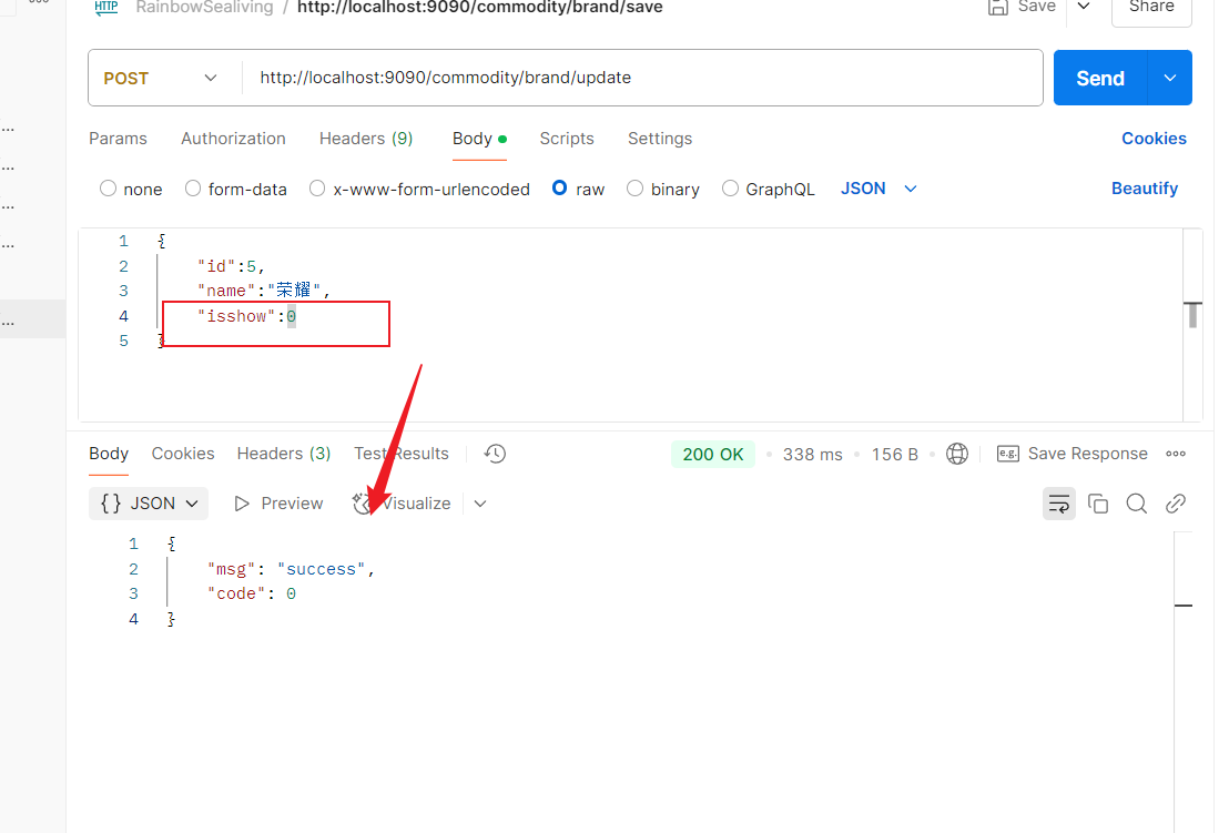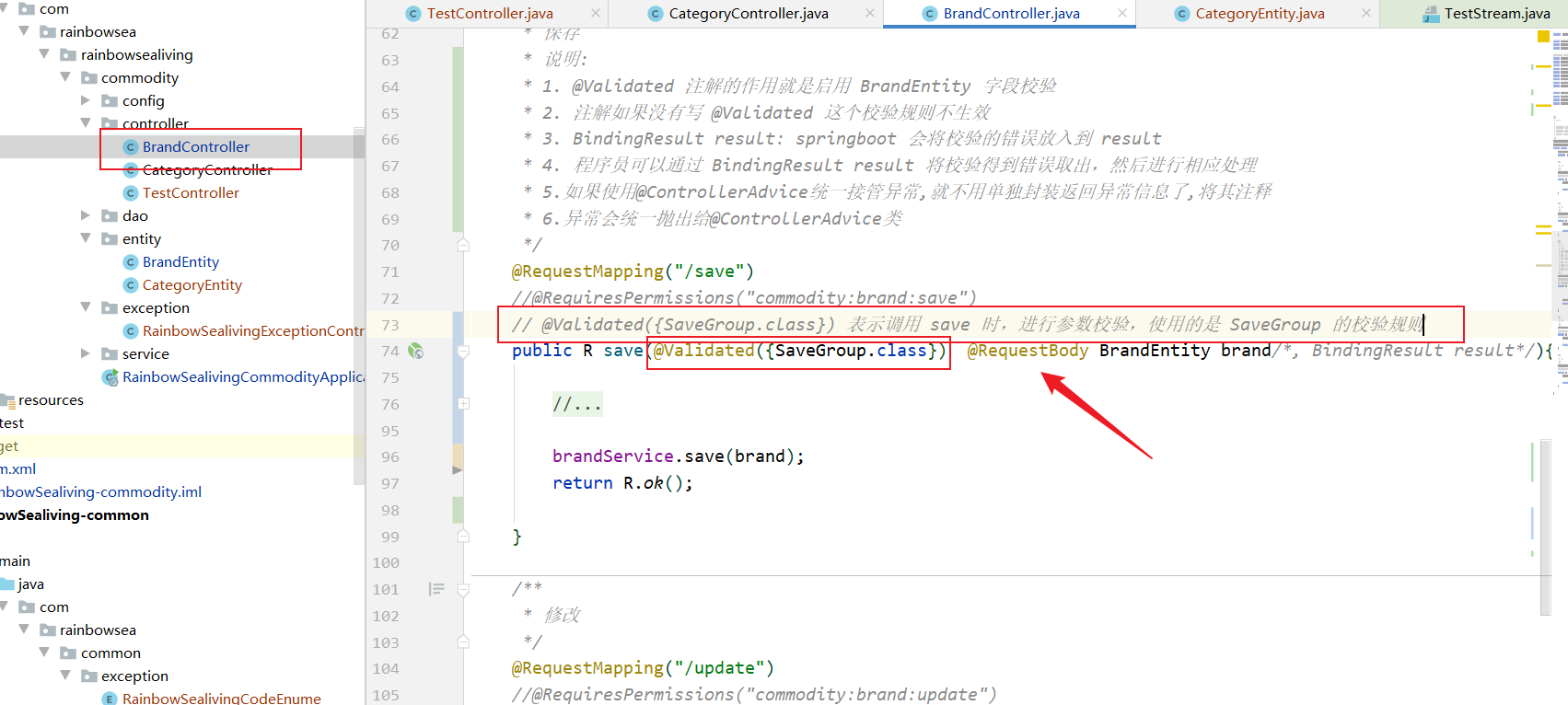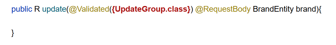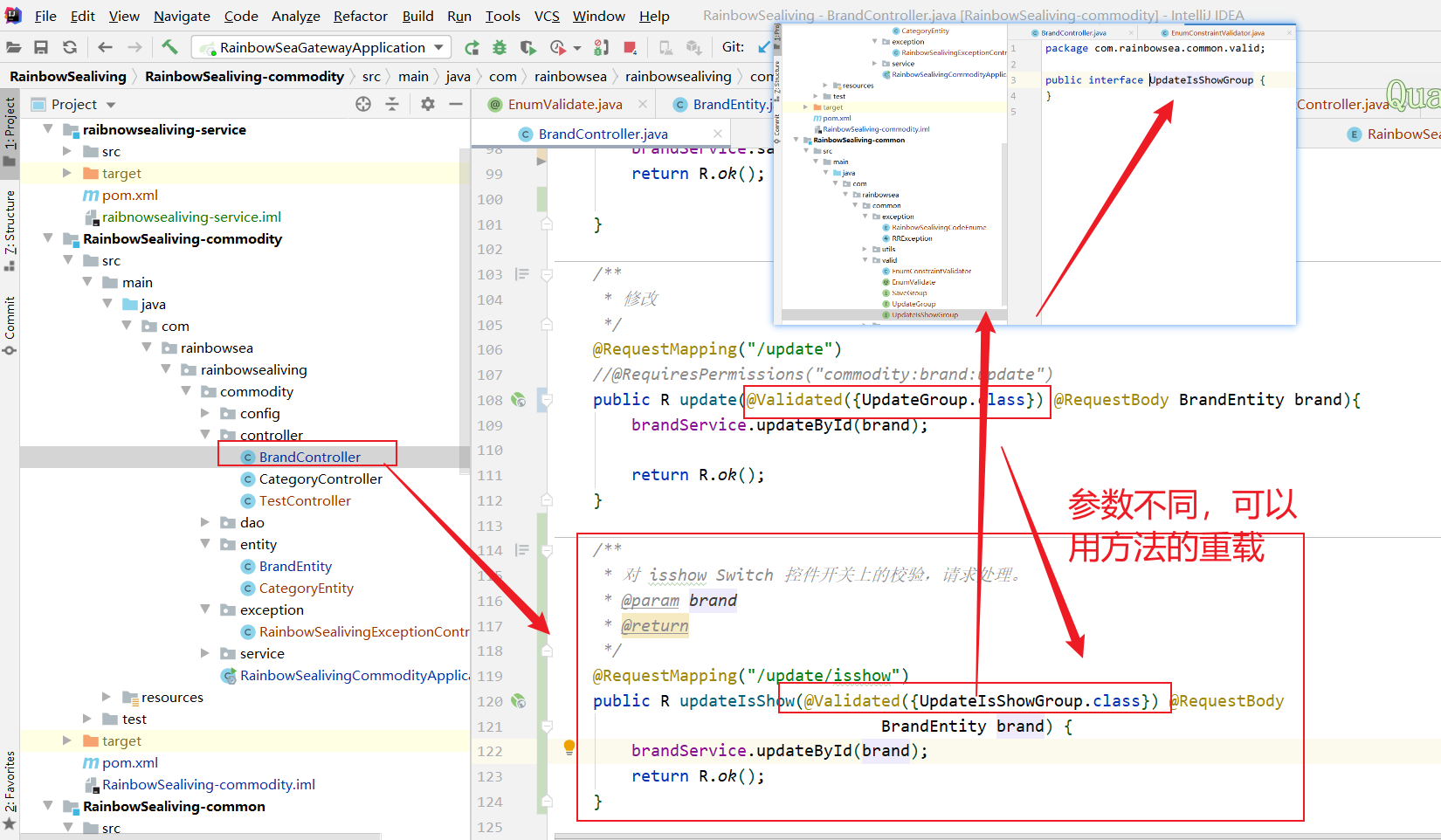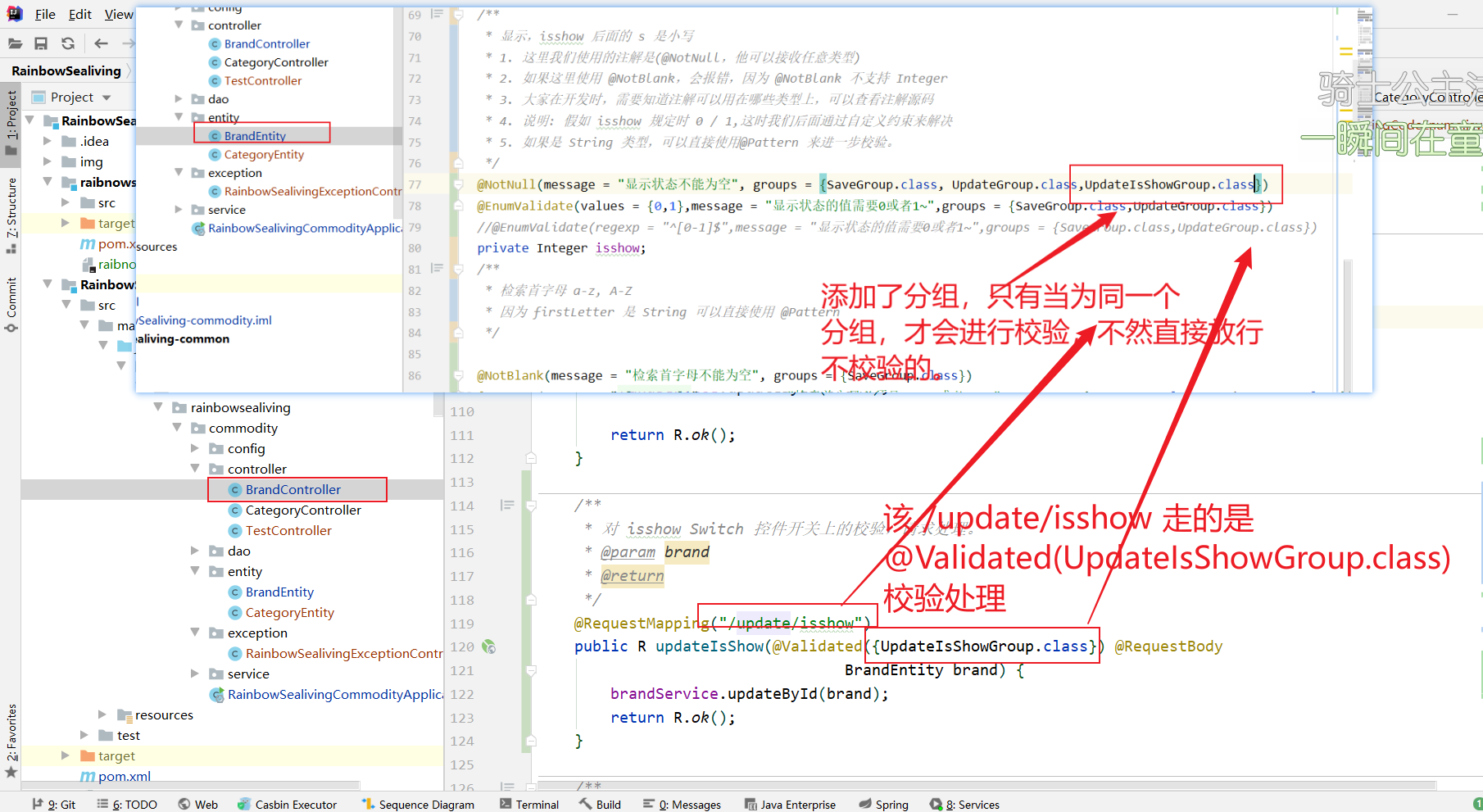 在对应 BrandController 请求处理的位置,添加上一个映射为 /update/issow/ 的请求,同时添加上 @Validated({UpdateIsShowGroup.class} 校验错误注解处理,这里使用了方法的重载。