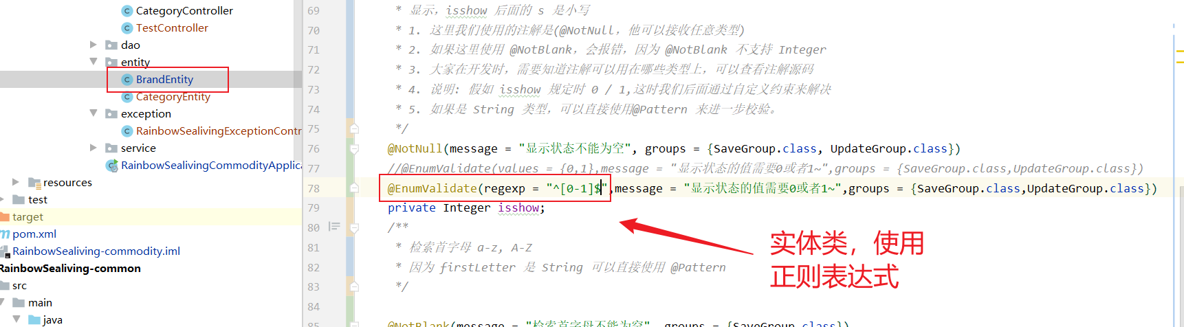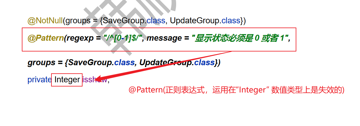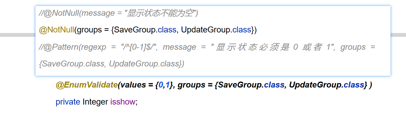 @EnumValidate(regexp = "^[0-1]$",message = "显示状态的值需要0或者1~",groups = {SaveGroup.class,UpdateGroup.class})