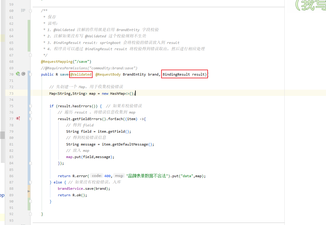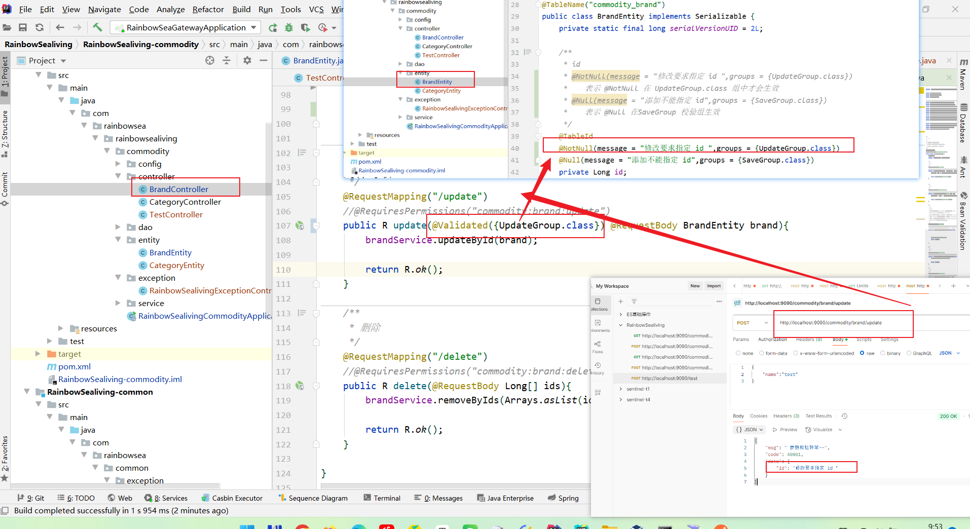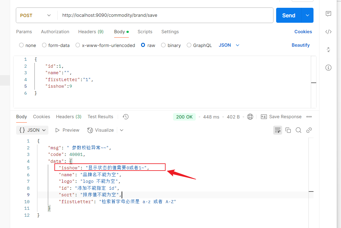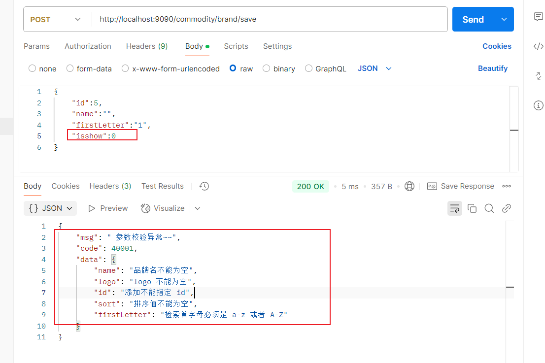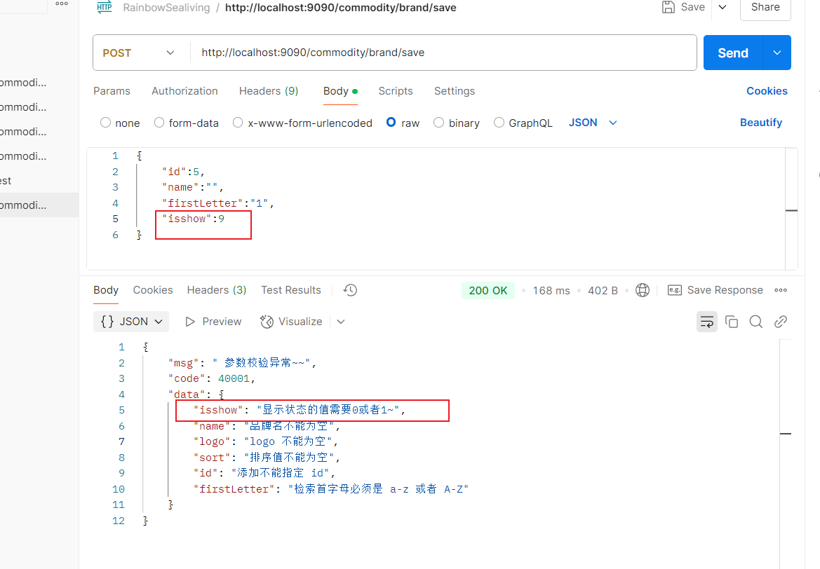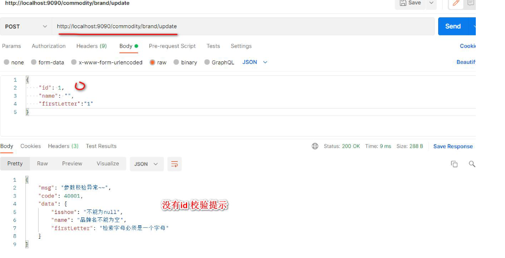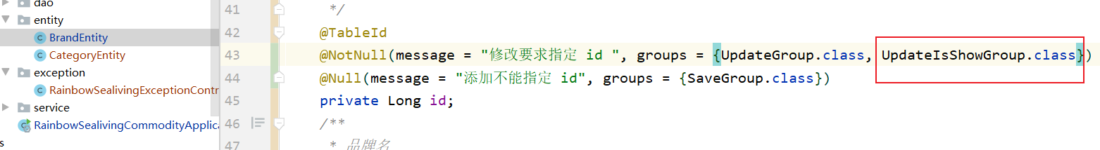 因为修改显示状态,只需要发送 id 和 isshow 两个值,也就是说,只需要校验 BrandEntity.java 的 id 和 isshow 即可
