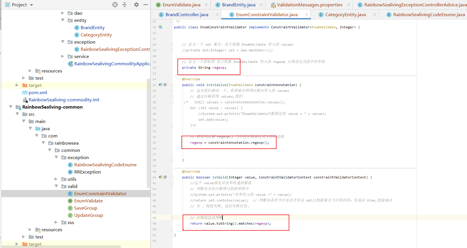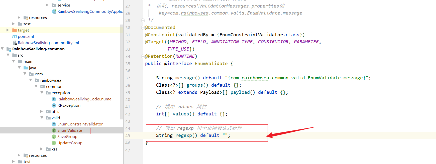 就是,将我们EnumConstraintValidator.java 自定义校验上的逻辑业务处理,将传过来的字符串,内容进行正则表达式的处理。