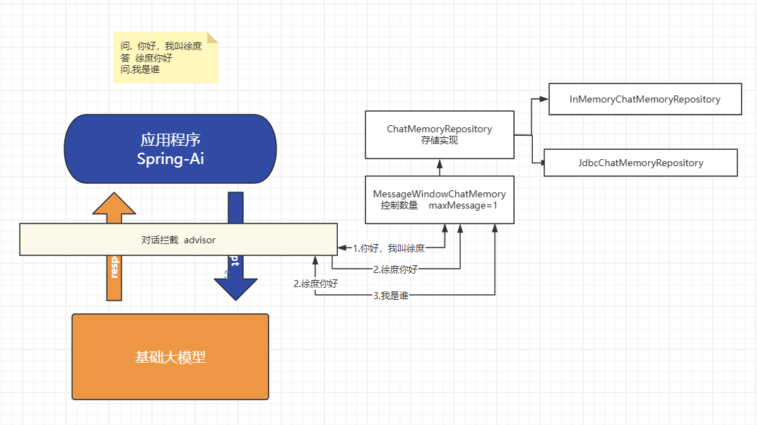 可以在每次对话的时候把当前聊天信息和模型的响应存储到ChatMemory, 然后下一次对话把聊天记录取出来再发给大模型。