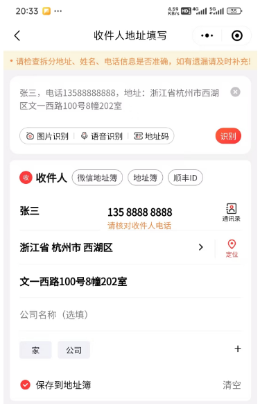 .user("收货人:张三,电话13588888888,地址:浙江省杭州市西湖区文一西路100号8幢202室")