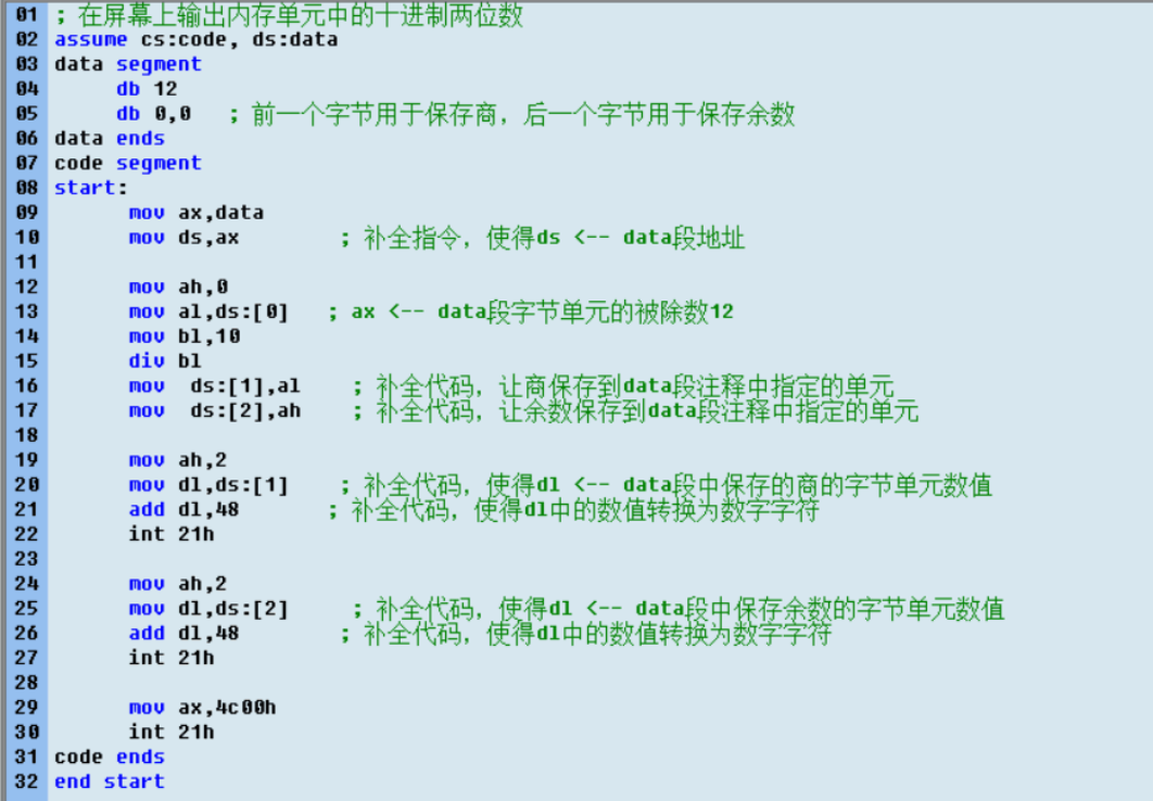 1. 补全程序t1.asm,完成在屏幕上输出内存单元中的十进制两位数 。