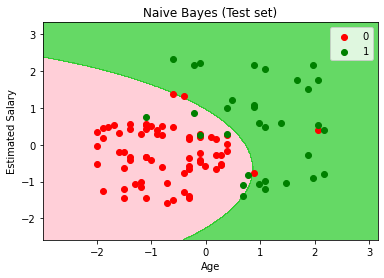 为了可视化分类效果,仅选取 Age 和 EstimatedSalary 这2个字段作为自变量