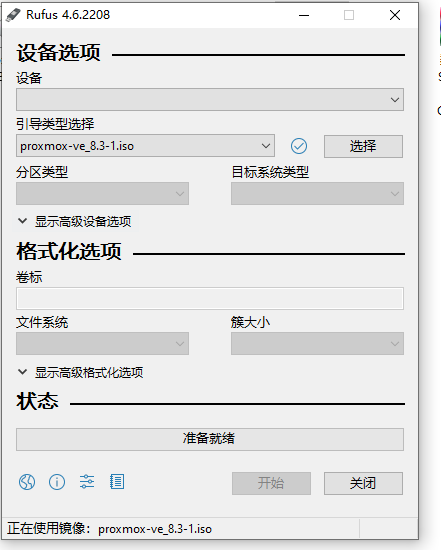 2、下载完成后直接双击运行,无需安装,设备中选择U盘,引导类型选择PVE镜像,然后点击开始,注意U盘中的原有数据会被格式化,重要数据记得备份。
